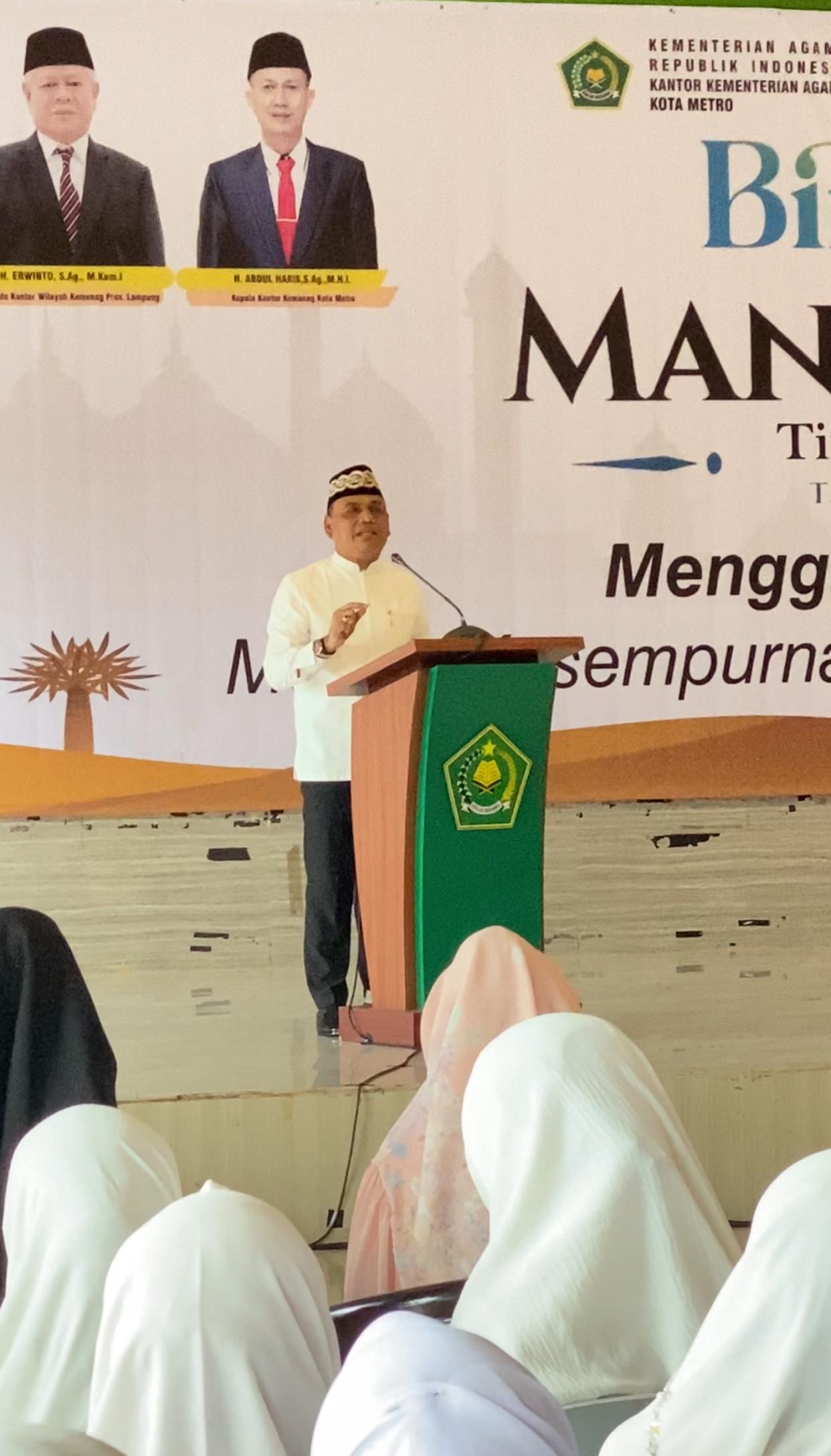 “Alhamdulillahirabbil’alamin, puji dan syukur kita panjatkan ke hadirat Allah Subhanahu Wa Ta’ala – Tuhan semesta alam, yang telah melimpahkan rahmat, nikmat dan karunia-Nya kepada kita semua, sehingga pada hari ini kita dapat bersilaturahmi dalam acara bimbingan manasik haji tingkat Kota Metro tahun 1446 H / 2025 M ini dalam keadaan sehat wal’afiat,” kata dia dalam sambutannya.